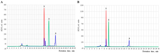 RP-HPLC elution profiles of crude oligonucleotides: (A) unmodified oligonucleotide 5′−DMTr−dT6 (1), Θ1 (2) and Φ1 (3); (B) unmodified oligonucleotide 5′−d(TTTTTT) (1), Θ2 (2) and Φ2 (3). Elution gradient I (Section 4).