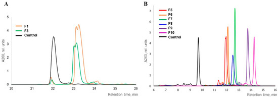 RP-HPLC elution profiles: (A) DMTr-conjugates F1 and F3 treated with 2M NH3/PriOH or CH3NH2/EtOH, respectively, compared to unmodified oligonucleotide 5′-DMTr-dT6 (control); elution gradient (I); (B) conjugates F5–F10 with 1,1-dimethylethylenediamine, compared to unmodified oligonucleotide dT6 (control); elution gradient (II).