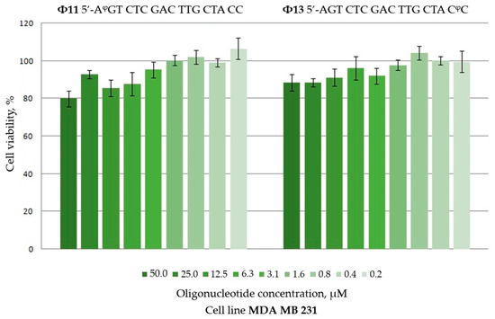 The nonspecific cytotoxicity of oligonucleotides Φ11 and Φ13 containing one perfluoro-1-octanesulfonyl phosphoramidate group at either 5′- or 3′-end, respectively, for human breast cancer cells MDA MB 231 was assessed via the MTT test. Based on the results of the experiment, presented as the percentage of living cells compared to control cells (Figure 5), it can be concluded that the introduction of one perfluorooctyl group at either end does not result in a significant dose-dependent toxicity for the cancer cell line (unless at the highest concentration of 50 μM).