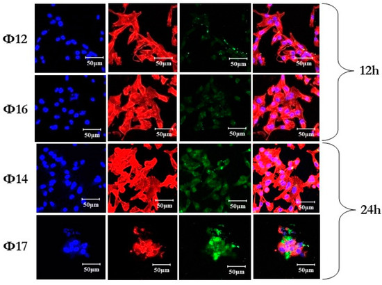 Next, we studied the ability of fluorescein-labeled 17 nt oligonucleotides containing one or two perfluoro-1-octanesulfonyl phosphoramidate groups to be taken up into human cells in the absence of a transfection agent. For this, MDA MB 231 cells were incubated with modified oligonucleotides at a concentration of 5.0 μM for 12 h (Φ12, Φ16) or 24 h (Φ14, Φ17). It was shown that oligonucleotides modified with perfluorooctyl groups are capable of slowly penetrating cells in the absence of a transfection agent and gradually accumulating inside as the incubation time increases from 12 to 24 h (Figure 6). The comparison of cellular uptake efficiency showed that the samples with one perfluorooctyl group are internalized predominantly into the cytoplasm with approximately the same efficiency regardless of the location of the modification at the 3′- or 5′-end. Meanwhile, the introduction of two perfluorooctyl groups mainly leads to the concentration of the oligonucleotide around the cell membrane, probably due to the ability of perfluorocarbon chains to self-associate, which led to slower cellular uptake. It will be interesting to compare the cell-penetrating ability of fluorocarbon chains vs. hydrocarbon chains (as per Ref. [84]), and we see this as a future avenue of our studies.