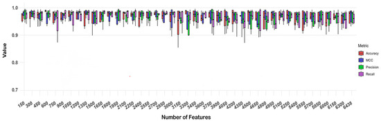 To assess model performance reliably and mitigate evaluation bias due to overfitting or uneven data distribution, we used five-fold cross-validation. We evaluated the model using four metrics: accuracy, precision, recall and MCC (Matthews Correlation Coefficient), and analyzed the results across each fold of the cross-validation. Figure 1 presents box plots of these metrics across different feature counts for each fold of the cross-validation. We observed that as the number of CpG sites increased from 150 to 6438, the evaluation metrics stabilized after five-fold cross-validation. Thus, we averaged the results across the five folds to assess the overall performance for each feature count.