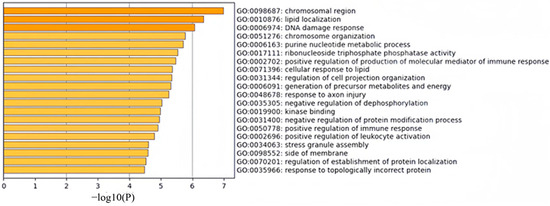 In terms of biological processes, a significant number of CpG sites were enriched in lipid localization, DNA damage response, chromatin organization, purine nucleotide metabolism, positive regulation of immune response mediator production, cellular response to lipids, regulation of cell projection organization, precursor metabolite and energy generation, response to axon injury, and negative regulation of dephosphorylation. Cellular component enrichment was mainly focused on chromosomal regions and membrane compartments, while molecular functions showed significant enrichment in ribonucleoside triphosphate phosphatase activity and kinase binding. Overall, this gene set appears to be involved in cellular structures such as chromosomal regions and cell membranes. Changes in chromosomal regions may relate to chromosome abnormalities [26] and DNA replication [27], whereas membrane components may be associated with cell membrane organization and function, as well as processes like cell signaling and substance exchange [28].