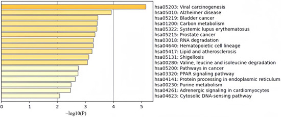 Visualization of KEGG pathway enrichment analysis results based on p-values. Seventeen KEGG pathways were identified, including Viral Carcinogenesis, Alzheimer’s Disease, Bladder Cancer, Carbon Metabolism, Systemic Lupus Erythematosus, Prostate Cancer, RNA Degradation, Hematopoietic Cell Lineage, Lipid and Atherosclerosis, Shigellosis, Valine, Leucine, and Isoleucine Degradation, Cancer Pathways, PPAR Signaling Pathway, Protein Processing in the Endoplasmic Reticulum, Purine Metabolism, Adrenergic Signaling in Cardiomyocytes, and Cytosolic DNA-Sensing Pathway.