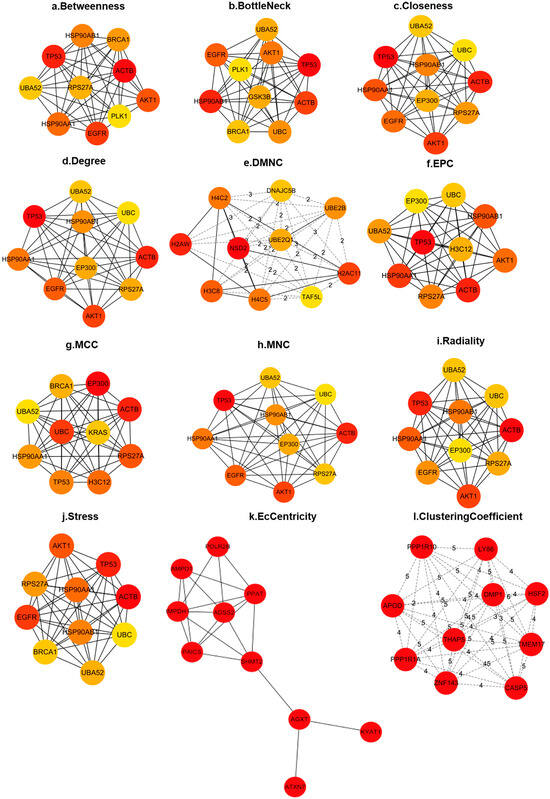 To further analyze the constructed PPI network, we employed the CytoHubba plugin in Cytoscape software version 3.10.1to evaluate and score genes within the network using various algorithms. This approach enabled the identification of key subnetworks composed of hub genes. Figure 4 presents these key subnetworks based on different algorithmic analyses. Across the results of twelve algorithms, the common hub genes with consistently high scores include ACTB, TP53, AKT1, EGFR, HSP90AA1, HSP90AB1, RPS27A, UBA52, EP300, BRCA1, and UBC.