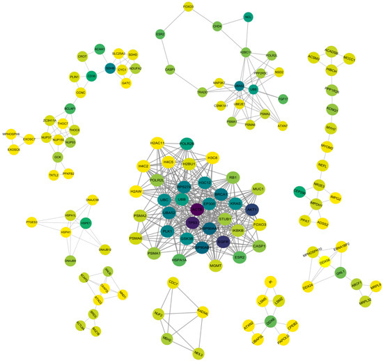 After histological analysis, ACTB, TP53, AKT1, EGFR, HSP90AA1, HSP90AB1, RPS27A, UBA52, EP300, BRCA1, and UBC were identified as key genes in the PPI net-work and crucial components of the key subnetworks. Among these, ACTB and TP53 are closely associated with various cancers, playing pivotal roles in tumorigenesis and cellular regulation [33,34]. AKT1 regulates cell proliferation, survival, and metabolism [35], while mutations in EGFR increase lung cancer sensitivity to tyrosine kinase inhibitor therapy [36]. HSP90AA1 and HSP90AB1 facilitate oncogene addiction, critical for cancer progression [37]. RPS27A is linked to colorectal cancer, hepatocellular carcinoma, chronic granulocytic leukemia, and renal cancer, with poor prognostic implications [38]. UBA52 plays a vital role in HSP90 ubiquitination and neurodegenerative signaling in Parkinson’s disease [39]. EP300, a histone acetyltransferase, regulates cell proliferation by mediating TP53 acetylation, essential for DNA damage response [40]. BRCA1 is associated with early-onset breast cancer and familial breast cancer syndrome [41]. Lastly, UBC encodes ubiquitin, responding robustly to cellular stressors such as ultraviolet irradiation, oxidative stress, and translational damage [42].