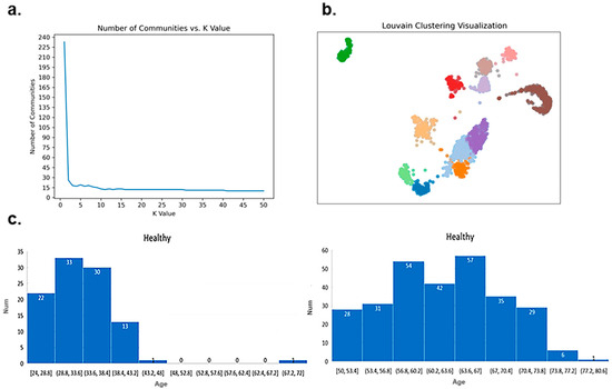 Figure 6b presents the clustering results obtained using the Louvain community detection algorithm. Among the twelve identified communities, the following associations were observed: Progressive supranuclear palsy and frontotemporal dementia were grouped into the same community, while frontotemporal dementia and Alzheimer’s disease clustered together in a separate group. Alzheimer’s disease and Parkinson’s disease each formed distinct individual communities. Rheumatoid arthritis was divided into two separate communities, and breast cancer samples were distributed across four distinct communities. Additionally, healthy samples were split into two communities, with a notable age difference between them. Figure 6c illustrates the age distribution histograms for these two healthy communities, with mean ages of 33.74 years and 62.38 years, respectively.