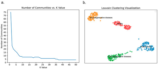 For the clustering process, we employed the Louvain community detection method on the global feature vectors. Experimental results indicated that as the value of K increased from 37 to 50, the number of communities stabilized at four, suggesting a stable clustering configuration within this range. Figure 7a illustrates the trend in the number of communities as K varies. When K is set to 37, the number of communities stabilizes at four, with each community containing 81, 79, 73, and 78 nodes, respectively. In the independent test set, the sample counts for neurodegenerative diseases, bone degenerative diseases, breast cancer, and healthy samples are 82, 78, 74, and 77, respectively, closely matching the distribution within the clustered communities.
