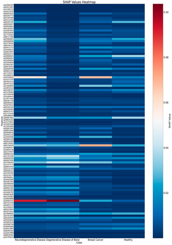 Each CpG site’s SHAP values are presented as four values, corresponding to its importance in predicting neurodegenerative diseases, bone degenerative diseases, breast cancer, and healthy states. Figure 8 displays a heatmap of SHAP values for each CpG site across these categories. The heatmap reveals that cg18481241 has a significant impact on predicting neurodegenerative and bone degenerative diseases, cg05744229 plays a crucial role in predicting breast cancer, and cg18750833 is influential in predicting both neurodegenerative diseases and breast cancer.
