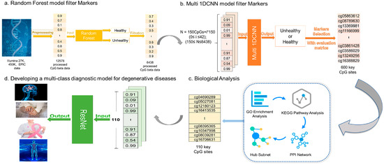 In this section, we describe the DNA methylation dataset and outline the methods used to select a representative set of biomarkers and construct a multi-class degenerative disease prediction model. As shown in Figure 9, our technical framework comprises four key steps: first, filtering biomarkers using the random forest method; second, selecting an optimal set of biomarkers through deep learning techniques; third, performing omics analysis; and finally, constructing a multi-class prediction model for degenerative diseases.