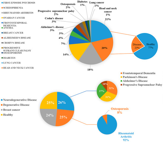 Pie chart of the dataset distribution. The DNA methylation data used for screening a representative set of biomarkers. The dataset includes information on the proportion of healthy and disease samples, with the disease samples further comprising information on the proportion of corresponding disease samples. DNA methylation data for multi-class degenerative disease prediction model. This figure illustrates the four categories of DNA methylation data used to construct the multi-class degenerative disease prediction model, showing the sample proportions for each category, and the breakdown of specific diseases and their sample proportions within each category.