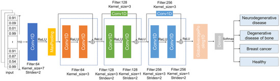 Figure 12 provides an overview of the architecture of our multi-class degenerative disease prediction model, ResDegNet, which is based on a residual network (ResNet). In this model, we built a prediction framework to classify multiple types of degenerative diseases. Initially, a one-dimensional convolutional layer was employed for feature extraction, followed by a MaxPooling layer to reduce the dimensionality of the feature maps.
