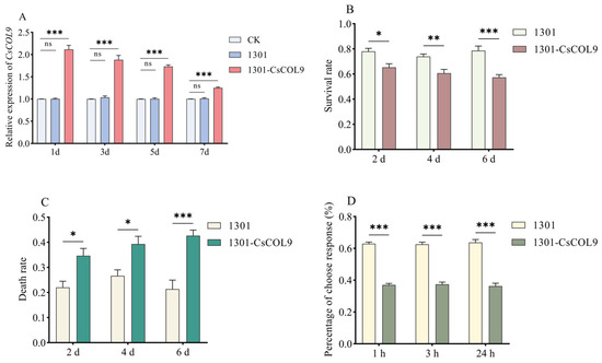 To investigate whether overexpression of CsCOL9 in host plants affects B. tabaci, we compared the survival rates and landing numbers of B. tabaci on CsCOL9 overexpression cucumbers plants (1301-CsCOL9) to those on control plants (1301). The results showed that the survival rate of B. tabaci on the leaves of 1301-CsCOL9 plants decreased (Figure 6B), while the mortality rate increased (Figure 6C). Additionally, compared to cucumbers containing the empty vector (1301), the number of B. tabaci landing on 1301-CsCOL9 plants was significantly reduced (Figure 6D). These results indicate that increase of CsCOL9 expression levels in host plants reduced B. tabaci survival rates and its host preference.