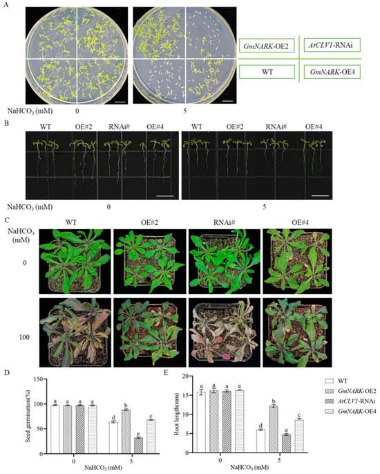 The above data indicated that GmNARK could be induced by alkali stress. We predict that GmNARK may play a certain role in plant resistance to alkaline stress. To aim at this goal, we obtained GmNARK overexpression Arabidopsis lines. At the same time, AtCLV1, is a homologous gene of the soybean GmNARK gene in Arabidopsis. The expression levels of Gm-NARK and AtCLV1 genes in Arabidopsis overexpression and knockdown lines were verified by RT-qPCR analyses (Figure S1A,B). First of all, we compared the germination rates of different Arabidopsis lines on 1/2 MS media with or without 5 mM NaHCO3. The seed germination data showed that all the Arabidopsis lines had equal germination rates on the control medium but demonstrated significant seed germination rates on the medium with alkaline stress. The WT, GmNARK overexpression, and AtCLV1-RNAi seeds had about 60%, 90%, and 30% germination rates, respectively. The cotyledons of AtCLV1-RNAi seedlings showed significant chlorosis with delayed root emergence (Figure 2A,D). The germinated seeds were transferred onto 1/2 MS media with or without alkaline stress for further growth. After growing for a few days, the plant phenotypes were investigated. The data showed that overexpression of the GmNARK gene and silencing of the AtCLV1 gene significantly promoted or inhibited plant growth compared to the WT line (Figure 2B,E). At the same time, the seedlings were transferred into potting soils for 3 weeks. The plants were irrigated with water or 100 mM NaHCO3 solution for a time. After a week, the plant growths were observed. The WT plants, especially AtCLV1-RNAi plants, showed severe wilting and chlorosis. The GmNARK overexpression plants exhibited healthy, bearing growth with green leaves with anthocyanin accumulation to some extent (Figure 2C), indicating that the soybean GmNARK, as well as its homolog AtCLV1, could positively regulate Arabidopsis tolerance to alkaline stress.