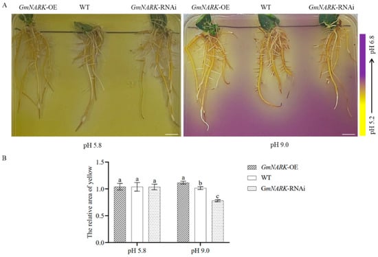 The obtained WT, GmNARK overexpression, and GmNARK-RNAi transgenic composite soybean lines were transferred to normal rooting agar plates (pH 5.8) and alkaline plates (pH 9.0), respectively, and these agar plates were supplemented with 0.004% bromocresol violet as a pH indicator. The pH change around the roots can be visualized and photographed. When the pH of the medium decreases from neutral to acidic, the color changes from purple to bright yellow, and the color bar shows the chromatogram as a function of pH in the same medium. The yellow-colored areas and intensities were quantified by using ImageJ software (version 1.53).
