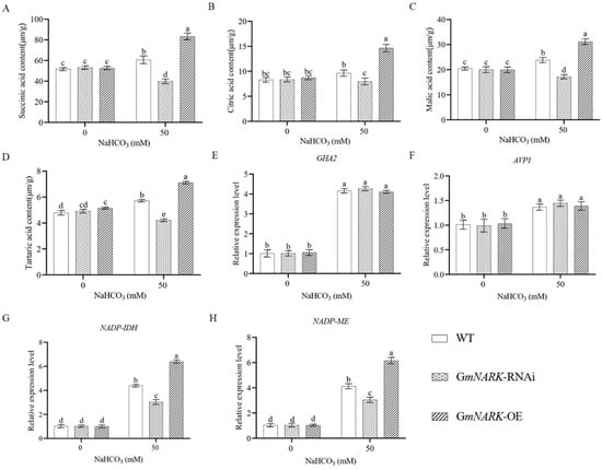 From the above results, we can see that GmNARK kinase can promote roots to secrete organic acids to maintain the acid–base balance in the rhizosphere when soybean plants are subjected to alkali stress. Therefore, we then determined the contents of succinic acid, citric acid, malic acid, and tartaric acid in the hairy roots of different soybean lines by HPLC (Figure 5A–D). The data showed that the contents of these four organic acids in hairy roots with overexpression of GmNARK were significantly higher than those of WT, and the contents of organic acids in hairy roots with GmNARK-RNAi were significantly lower than those of WT under alkali stress. These results indicate that the hairy roots overexpressing GmNARK adapt to alkali stress by secreting organic acids and neutralizing high pH environments. To further investigate how GmNARK increases the tolerance of transgenic soybean hairy roots to an alkaline stress environment simulated by NaHCO3, we measured the expression patterns of four alkaline stress-responsive genes: GHA2 (H+-ATPase gene), AVP1 (inorganic pyrophosphatase gene), NADP-IDH (isocitrate dehydrogenase gene), and NADP-ME (malaise gene) (Figure 5E–H). The RT-qPCR data showed that the transcription levels of NADP-IDH and NADP-ME genes were upregulated in GmNARK overexpression plants and downregulated in GmNARK-RNAi plants, and there was no significant difference in the expression levels of GHA2 and AVP1 genes between normal and alkali stress conditions. These data further indicate that the major role of GmNARK kinase in the enhancement of soybean resistance to alkaline stress is to promote roots to secrete organic acids and neutralize alkali stress in the rhizosphere.