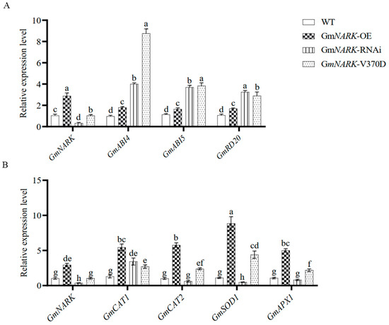In order to further explore the mechanism of how GmNARK kinase positively regulates soybean response to alkali stress, we used the RT-qPCR method to investigate the expression patterns of stress-related genes in the transgenic hairy roots.