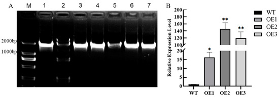 Identification of transgenic Arabidopsis lines. (A) PCR identification of T3 transgenic Arabidopsis thaliana, m: 2000 bp; 1: plasmid; 2: wild-type Arabidopsis thaliana; 3–7: transgenic Arabidopsis. (B) qRT-PCR detection of transgenic Arabidopsis was determined using the Student’s t-test, and the error bar represents the standard error (n ≥ 3, * p < 0.05; ** p < 0.01). WT and OE are the abbreviations of wild type and overexpression line, respectively.