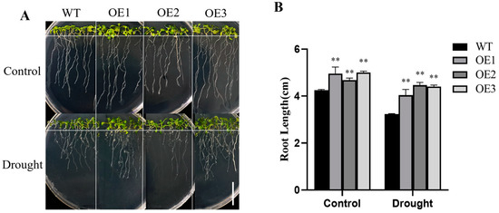 The WT and transgenic Arabidopsis seeds were surface disinfected (10% sodium hypochlorite for 3 min, followed by rinsing with absolute ethanol, cleaning 3-5 times for 2 min) and sown on a 1/2 MS medium, and a 1/2 MS medium containing 6% PEG 6000 [61], and cultured vertically for 10 d. Arabidopsis seedlings were photographed after 10 d, and their root length was determined.