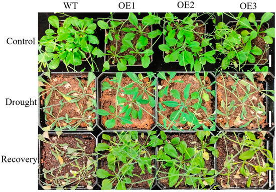 Phenotypes of wild-type and OE lines at the rosette stage under drought stress. WT and OE are the abbreviations of wild type and overexpression line, respectively. Control: wild-type and OE lines cultivated under normal conditions for 30 days; Drought: wild-type and OE lines after 21 days of drought treatment; Recovery: wild-type and OE lines after 3 days of rehydration after drought treatment. Scale bar = 2 cm. (Culture conditions of control group is 20–22 °C, the light cycle is 16/8 h, and the relative humidity is 60–70%; the drought treatment group was not watered.)