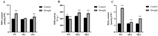 Physiological index data analysis of WT and OE lines under normal and drought treatment. (A) MDA content. (B) SOD enzyme activity. (C) H2O2 content. The data were analyzed by the Student’s t-test, and the error bar indicates the standard error (n ≥ 3, ** p < 0.01). WT and OE are the abbreviations of wild type and overexpression line, respectively. MDA, SOD, and H2O2 are abbreviations of malondialdehyde, superoxide dismutase, and hydrogen peroxide, respectively.