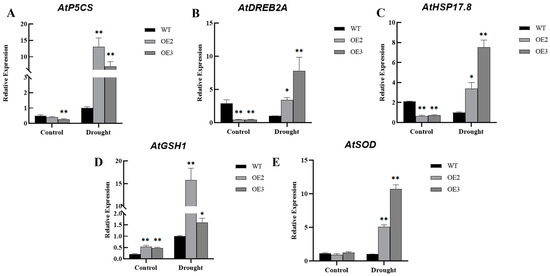 Expression analysis of stress-related genes under drought conditions. Relative expressions of AtP5CS (A), AtDREB2A (B), AtHSP17.8 (C), AtGSH1 (D), and AtSOD (E). The Student’s t-test was employed to ascertain significant differences, and the error bar indicated the standard error (n ≥ 3, * p < 0.05; ** p < 0.01). WT and OE are the abbreviations of wild type and overexpression line, respectively.