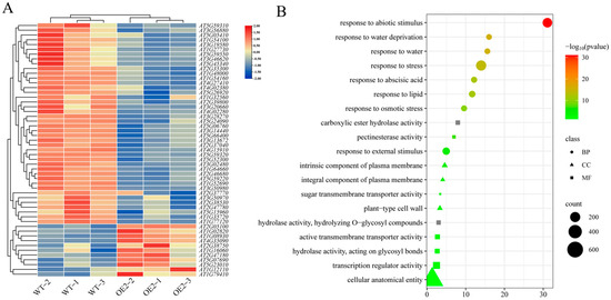 GO enrichment map of differentially expressed genes. (A) Cluster analysis of differentially expressed genes of WT and OE2 involved in GO entries in the dehydration response. (B) Bubble map of GO functional enrichment analysis of differentially expressed genes in WT vs. OE2. WT and OE are the abbreviations of wild type and overexpression line, respectively. BP, CC, and MF are abbreviations of biological processes, cellular components, and molecular functions, respectively. GO is the abbreviation of gene ontology.