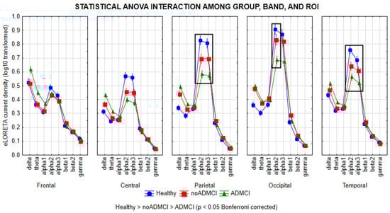 Figure 1 shows the mean values (± standard error of the mean, SE; log−10 transformed values) of rsEEG source activities (i.e., regional normalized eLORETA current densities) relative to a statistically significant ANOVA interaction effect (F = 6.0; p < 0.0001) among the factors Group (Healthy, noADMCI, and ADMCI), Band (delta, theta, alpha 1, alpha 2, alpha 3, beta 1, beta 2, and gamma), and ROI (frontal, central, parietal, occipital, and temporal).