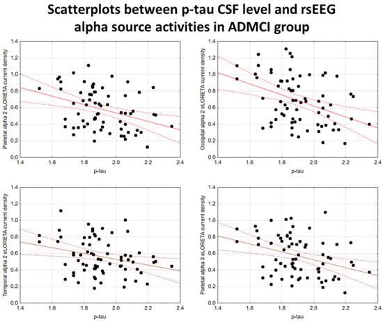 Scatterplots showing the associations between CSF p-tau levels and rsEEG alpha source activities (i.e., parietal alpha 2, occipital alpha 2, temporal alpha 2, and parietal alpha 3) in the ADMCI patients (each circle corresponds to a patient). General linear models (GLMs) evaluated the hypothesis of an association between the CSF and rsEEG variables (p < 0.05). Legend: CSF p-tau = phosphorylated form of tau in cerebrospinal fluid; rsEEG = resting-state electroencephalographic; ADMCI = patients with mild cognitive impairment due to Alzheimer’s disease. Dots represent individual data points, where each dot shows the values of two variables. The solid red line (line of best fit) is a line drawn through the dots to show the overall trend or relationship between the variables, indicating whether the correlation is positive, negative, or absent. The dotted red lines (Confidence lines) indicate the range where we expect the true values to fall with the 95% level of confidence.