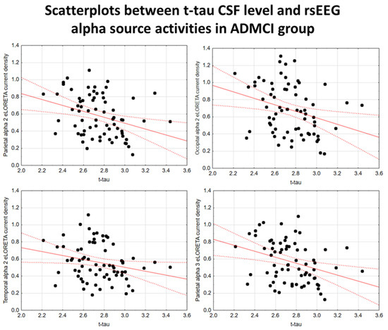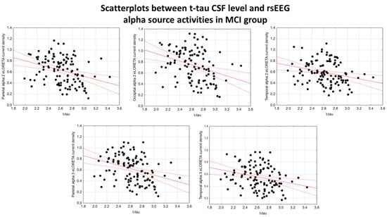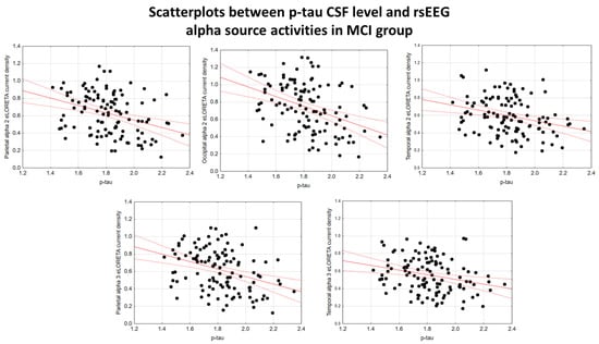 In the extended MCI (i.e., ADMCI+noADMCI) group, there were statistically significant negative associations between the CSF p-tau levels and the parietal alpha 2 (β = −0.351, t = −3.98, p = 0.001), occipital alpha 2 (β = −0.387, t = −4.46, p = 0.001), temporal alpha 2 (β = −0.286, t = −3.17, p = 0.002), and parietal alpha 3 (β = −0.351, t = −3.99, p = 0.001) source activities estimated from the rsEEG activity using the conservative statistical threshold of p < 0.05 corrected (p < 0.0033). Along the same line, statistically significant negative associations between the CSF t-tau levels and the parietal rsEEG alpha 2 (β = −0.323, t = −3.62, p = 0.001), occipital alpha 2 (β = −0.327, t = −3.67, p = 0.001), and parietal alpha 3 (β = −0.333, t = −3.75, p = 0.001) source activities were found. The higher the CSF p-tau or t-tau levels (increasing the probability of being positive to the diagnostic CSF biomarkers for AD), the lower the rsEEG alpha source activities.