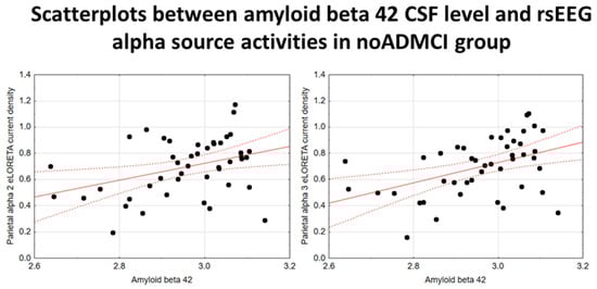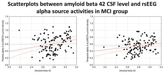 Using an explorative statistical threshold of p < 0.05 uncorrected, there were positive associations between the CSF Aβ42 levels and the parietal rsEEG alpha 3 (β = 0.224, t = 2.45, p = 0.01) and the temporal rsEEG alpha 3 (β = 0.183, t = 1.98, p = 0.05) source activities in the extended MCI (i.e., ADMCI+noADMCI) group. The lower the CSF Aβ42 levels (increasing the probability of being positive to the diagnostic CSF biomarkers for AD), the lower the rsEEG alpha source activities. Figure 7 shows the scatterplots of those positive associations, showing a marginal relationship between brain amyloidosis and posterior rsEEG alpha rhythms in the extended MCI group.