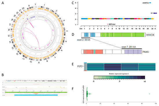 Alterations identified using OGM and NGS. (A) Circos plot showing chromoplexy between chromosomes 9, 16, and 18; chromothripsis of chromosome 21; deletions on chromosomes 7, 13, 20, and 22; and trisomy of X. An ALL-directed filter was applied to show clinically relevant variants in this disease. (B) 13q12.2 deletion juxtaposing FLT3 and PAN3. (C) CNVs identified by NGS (Allseq) and MLPA (P335 and P327). (D) Schematic representation of the WWOX::PAX5 fusion identified using NGS (Archer PanHeme). (E) Relative expression of FLT3 quantified using NGS; the second column shows patient’s expression, while the first, third, and fourth columns belong to healthy controls. (F) Relative expression (>90-fold) of FLT3 compared to 30 healthy controls quantified using RT-qPCR.