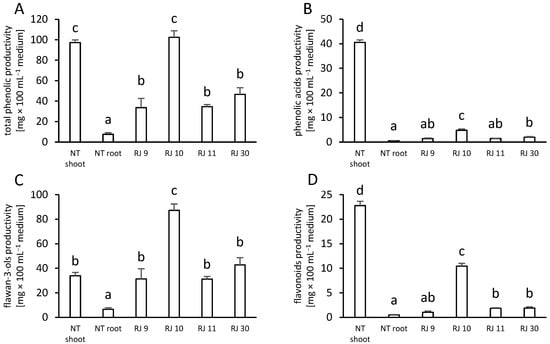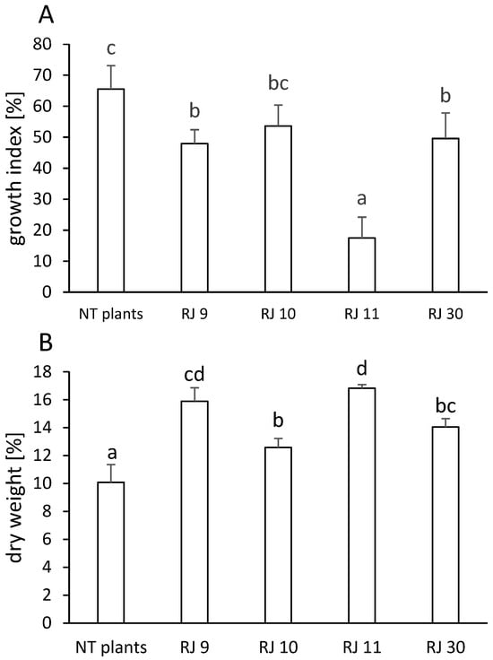 | NT root | 10.8 ± 0.8 a | 7.7 ± 0.3 b | 15.8 ± 0.6 b | 0.9 ± 0.1 ab | 14.2 ± 0.3 ab | 49.4 ± 1.2 a |