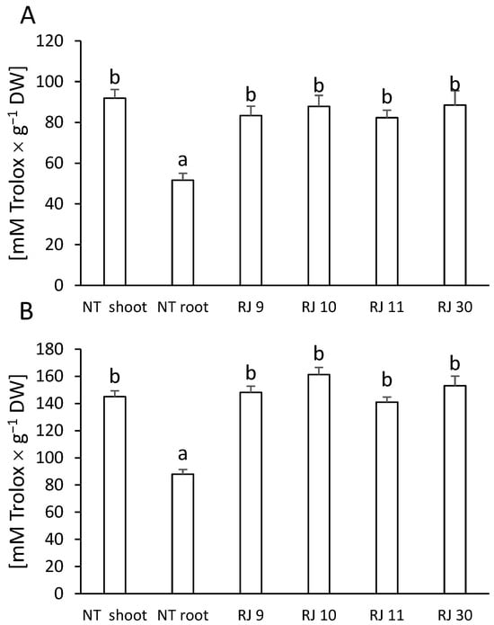| NT root | 7.3 ± 0.8 | 1.1 ± 0.2 a | 2.9 ± 0.1 a | 4.0 ± 0.7 c | 31.9 ± 0.4 b | 47.0 ± 1.5 b |