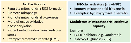 Some of these mitochondria-targeting drugs are natural products that activate PGC1-α, AMPK, or nuclear factor erythroid 2–related factor 2 (Nrf2). However, the caveat is that most natural products have multiple mechanisms of action, so it may be difficult to distinguish their effects on the mitochondria from other beneficial effects. Sulforaphane, resveratrol, and curcumin activate Nrf2. Nrf2 regulates mitochondria ROS formation, promotes mitophagy, promotes mitochondrial biogenesis and more efficient oxidative phosphorylation, and also protects mitochondria from oxidative stress by increasing transcription of antioxidants [199]. Separately, Nrf2 also reduces inflammation through repression of transcriptional upregulation of pro-inflammatory cytokine genes [200], and it is mainly for this purpose that Nrf2 activators are currently used clinically. However, in a recently published clinical trial, the most widely used Nrf2 activator dimethyl fumarate (DMF) did not alter the clinical status of hospitalized COVID-19 patients [201]. Arguably, in this study, the 5-day observation period for each patient does not allow adequate time for long-term Nrf2 effects on mitochondria to be clinically evident; hence, performing a DMF trial as treatment for long COVID instead, over at least 6 months, would still be relevant. Likewise, a short-term resveratrol trial for treating mild COVID-19 cases in an outpatient setting also showed no significant benefit [202], but the logistics of that study led to a median lag time of 5 days from symptom onset to treatment, which would most likely have reduced the therapeutic benefit, and its effect on long COVID was not studied. Quercetin (a flavonoid) and hydoxytyrosol (a polyphenol) improve mitochondrial biogenesis through activation of PGC-1α via AMPK [199]. Clinical studies on these products have been very small in scale [203] and focused mainly on speed of recovery from acute COVID-19 symptoms, but their effects on mitochondria pathology deserve longer-term in-patient study.