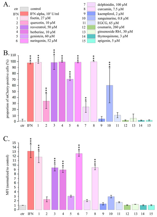 Flow cytometry data for the expression of mCherry driven by IFN-sensitive responsive element (ISRE) in HeLa TI ISRE-mCherry cells after PSM treatment for 24 h. (A) Color–numeric designation of PSMs and their non-toxic concentrations. Ctr—control; IFN—IFN-α, 103 U/mL; 1—fisetin, 27 µM; 2—quercetin, 10 µM; 3—resveratrol, 50 µM; 4—berberine, 10 µM; 5—genistein, 60 µM; 6—naringenin, 52 µM; 7—delphinidin, 100 µM; 8—curcumin, 7.5 µM; 9—kaempferol, 2 µM; 10—sanguinarine, 0.8 µM; 11—EGCG, 65 µM; 12—coumarin, 260 µM; 13—ginsenoside Rb1, 30 µM; 14—thymoquinone, 3 µM; 15—apigenin, 5 µM. This color-number legend is used in all figures. (B) Proportions of the cells expressing mCherry. (C) Mean fluorescence intensity of mCherry per cell (normalized to control). The data are presented as an average value ± SD. Significance of the differences between control untreated cells and PSM-treated cells was determined using ANOVA test and Dunnett’s post hoc test: significant difference, **—p < 0.01, ***—p < 0.001.