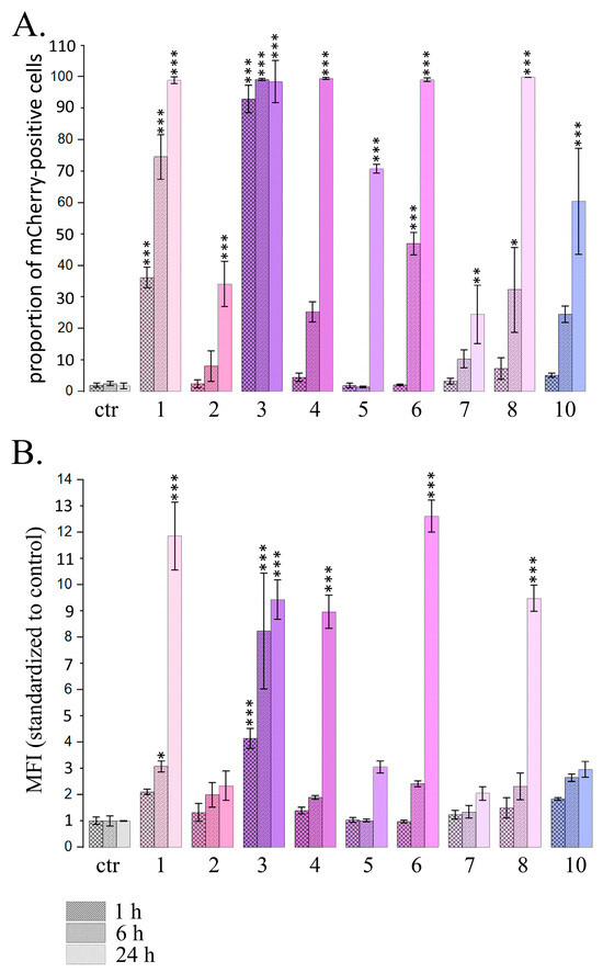 For PSMs, which caused a significant increase in the proportion of cells expressing mCherry after 24 h treatment, we also analyzed the dynamics of the changes after 1, 6 and 24 h PSM treatment (Figure 2).