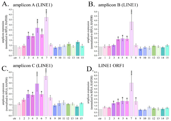 Expression of three LINE1 amplicons (A–C) and ORF1 LINE1 gene (D) in HeLa cells treated with maximal non-toxic concentrations of PSMs for 24 h. Ctr—control; 1—fisetin, 27 µM; 2—quercetin, 10 µM; 3—resveratrol, 50 µM; 4—berberine, 10 µM; 5—genistein, 60 µM; 6—naringenin, 52 µM; 7 –delphinidin, 100 µM; 8—curcumin, 7.5 µM; 9—kaempferol, 2 µM; 10—sanguinarine, 0.8 µM; 11—EGCG, 65 µM; 12—coumarin, 260 µM; 13—ginsenoside Rb1, 30 µM; 14—thymoquinone, 3 µM; 15—apigenin, 5 µM. The data are presented as M ± SD. Significance of the differences between PSM treated cells and control untreated cells was determined using ANOVA test and Dunnett’s post hoc test: significant difference, *—p < 0.05, **—p < 0.01, ***—p < 0.001.