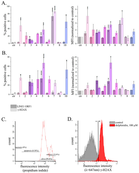 Flow cytometry analysis of HeLa cells treated with PSMs in non-toxic concentrations and immunofluorescently stained ORF1 LINE1 or γ-H2AX. (A,B) The effects of 24 h treatment with PSMs on the proportions of stained cells. Ctr—control; 1—fisetin, 27 µM; 2—quercetin, 10 µM; 3—resveratrol, 50 µM; 4—berberine, 10 µM; 5—genistein, 60 µM; 6—naringenin, 52 µM; 7—delphinidin, 100 µM; 8—curcumin, 7.5 µM; 10—sanguinarine, 0.8 µM. (B) PSM treatment for 72 h. Ctr—control; 1—fisetin, 13.5 µM; 2—quercetin, 5 µM; 3—resveratrol, 25 µM; 4—berberine, 5 µM; 5—genistein, 30 µM; 6—naringenin, 26 µM; 7—delphinidin, 50 µM; 8—curcumin, 3.7 µM; 10—sanguinarine, 0.4 µM. The data are presented as M ± SD. Significance of the differences between control untreated cells and PSM treated cells was determined using ANOVA test and Dunnett’s post hoc test: significant difference, *—p < 0.05, **—p < 0.01, ***—p < 0.001. (C) Measurement of proportion of apoptotic cells in the analyzed populations of fixed cells. (D) HeLa cells treated with delphinidin for 24 h with the immunofluorescently stained γ-H2AX.