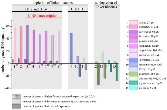 Concerning PSMs 12–15 which do not cause chromatin-bound linker histone depletion, the following data were published: thymoquinone was shown to actually decrease type I IFN signaling activity in RAW 264.7 and MCF-7 cells [64]; for ginsenoside RB1 in CRFK 157 cells after 48 h treatment, no activation of type I IFN signaling was observed [65]; apigenin was shown to influence the inhibitory effect of IFN-α on cancer cell viability, wherein said viability is mediated by 26S proteasome inhibition (however, the effect of apigenin itself on type I IFN signaling was not analyzed) [66].