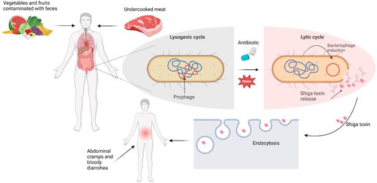 Mechanism of enterohemorrhagic Escherichia coli (EHEC) infection and Shiga toxin production. The scheme outlines the infection pathway following the ingestion of contaminated food, such as vegetables, fruits, or undercooked meat. EHEC carries a prophage that remains latent during the lysogenic cycle. Upon exposure to environmental stressors, including antibiotic treatment, the prophage is activated, triggering the lytic cycle and subsequent Shiga toxin production. The toxin enters host cells through endocytosis, leading to severe gastrointestinal symptoms, including abdominal cramps and bloody diarrhea. The presented scheme was prepared based on [4,5]. Created in BioRender. https://BioRender.com/y08b332.