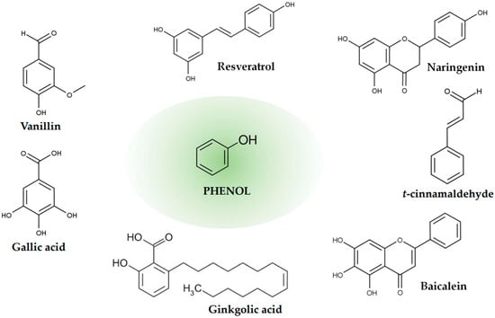 Common phenolic compounds include (i) polyphenols, such as lignin and tannins; (ii) oligophenols, such as flavonoids, stilbenes, and coumarins; and (iii) monophenols (simple phenolic acids), such as benzoic acid derivatives (hydroxybenzoic acids) and cinnamic acid derivatives (hydroxycinnamic acids). Phenols and polyphenols are a diverse group of chemical compounds characterized by the presence of at least one aromatic ring and hydroxyl groups (Figure 3). Based on the number and arrangement of carbon atoms, they are classified into 10 major classes [53,54]. This structural diversity translates into a broad spectrum of biological functions. To date, more than 8000 polyphenols have been identified, known not only for their potent antioxidant properties but also for their antimicrobial, antifungal, and antibacterial activities [55,56]. In addition to their direct impact on metabolic pathways, polyphenols also exert anti-inflammatory effects by downregulating production of pro-inflammatory cytokines and modulating immune responses. Their antioxidant potential extends to protecting cells from oxidative damage, which is linked to a reduction in the risk of neurodegenerative disorders such as Alzheimer’s and Parkinson’s disease and the prevention of cardiovascular diseases and cancers [57]. Recent studies have also explored their role in improving gut health, as polyphenols can influence the composition of the intestinal microbiota, promoting beneficial bacteria and suppressing pathogenic strains [58]. Furthermore, they have the ability to modulate various signaling pathways, including the regulation of cytochrome P450 enzyme activity, which influences drug metabolism [59,60]. For example, epigallocatechin gallate (EGCg) inhibits the activity of cytochrome P450 enzymes, while bergamottin, a natural compound found in grapefruit, inhibits the CYP2C19 isoenzyme, affecting detoxification mechanisms. A significant part of the research explores the impact of polyphenols on pathogenic E. coli, particularly enterohemorrhagic strains (as shown in Table 1).