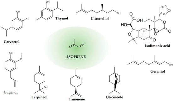 Terpenes and terpenoids are naturally occurring compounds found in various plants, including fruits, vegetables, and herbs. They contribute to the characteristic flavors and aromas of these plants and often have therapeutic properties [114]. Some terpenes and terpenoids have been studied for their potential antibacterial properties, including their effects against pathogenic bacteria such as E. coli, and specifically Shiga toxigenic strains [40,115]. Terpenes are hydrocarbons derived from the combination of isoprene units (C5) (Figure 4), while terpenoids are modified terpenes that have undergone oxidation or other chemical alterations. Both terpenes and terpenoids can exhibit antimicrobial activity through various mechanisms, including disrupting bacterial cell membranes, interfering with cell wall synthesis, and inhibiting essential enzymes [114,115,116].