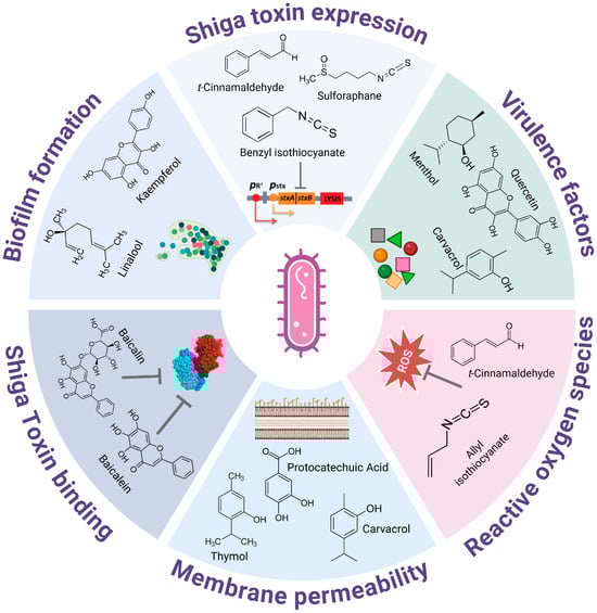 With the rise of antibiotic resistance, plant-derived compounds—or phytochemicals—are increasingly recognized as promising alternatives and adjuncts for combating bacterial infections. Compounds like polyphenols, terpenes, and ITCs exhibit diverse antimicrobial mechanisms, including membrane disruption, inhibition of virulence signaling pathways, and suppression of genes crucial for bacterial pathogenicity (Figure 5). While certain phytochemicals, such as thymol and eucalyptol, are already FDA-approved for over-the-counter antiseptic products, others, like EGCg and sulforaphane, are under active investigation in clinical trials. Nevertheless, phytochemicals offer significant potential for integration into existing food-safety protocols as natural antimicrobials [173,174,175]. These compounds can serve as secondary hurdles, complementing established practices like pasteurization, refrigeration, and chemical preservatives, to provide additional protection against microbial contamination. Effective integration requires careful consideration of several factors, including their antimicrobial efficacy under typical storage and processing conditions, and their compatibility with various food matrices. Furthermore, compliance with regulatory frameworks is necessary, including safety evaluations, toxicological assessments, and adherence to labeling standards set by regulatory agencies such as the Food and Drugs Administration (FDA) and the European Food Safety Authority (EFSA). This review underscores the potential of these bioactive compounds to modulate EHEC virulence specifically and highlights how their unique mechanisms can effectively support or potentially replace traditional antibiotics. As research progresses, the distinct properties of phytochemicals may offer safer and more targeted solutions for controlling bacterial pathogens without fostering resistance.