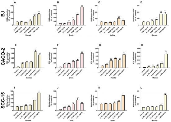 Effect of increasing concentrations (0.062, 0.125, 0.250, 0.500, and 1.000 mg/mL) of extracts from garlic cultivars Harnaś, Ornak, Violeta, and Morado on ROS production in (A–D) BJ, (E–H) CACO-2, and (I–L) SCC-15 cells after 24 h of exposure. Results are presented as mean ± SD. Statistically significant differences from the control are marked as * p < 0.05, ** p < 0.01, and *** p < 0.001.