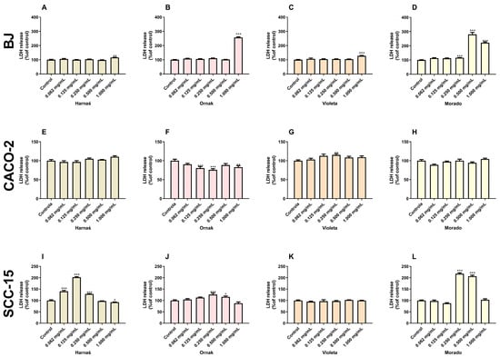 Effect of increasing concentrations (0.062, 0.125, 0.250, 0.500, and 1.000 mg/mL) of extracts from garlic cultivars Harnaś, Ornak, Violeta, and Morado on LDH release in (A–D) BJ, (E–H) CACO-2, and (I–L) SCC-15 cells after 24 h of exposure. Results are presented as mean ± SD. Statistically significant differences from the control are marked as * p < 0.05, ** p < 0.01, and *** p < 0.001.