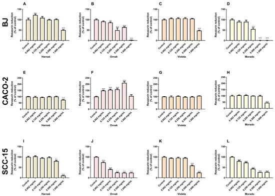 The Morado garlic cultivar significantly decreased resazurin reduction in the BJ cell line at concentrations of 0.250, 0.500, and 1.000 mg/mL by 45.3%, 99.1%, and 99.0%, respectively, compared with the control (Figure 3D). In the CACO-2 cell line, the Morado cultivar extract decreased resazurin reduction only at the highest concentration (1.000 mg/mL) by 55.4% compared with the control (Figure 3H). In the SCC-15 cell line, all tested concentrations (0.062, 0.125, 0.250, 0.500, and 1.000 mg/mL) of the extract decreased resazurin reduction by 19.8%, 27.2%, 56.6%, 72.9%, and 72.0%, respectively, compared with the control (Figure 3L).