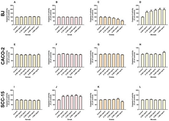 Effect of increasing concentrations (0.062, 0.125, 0.250, 0.500, and 1.000 mg/mL) of extracts from garlic cultivars Harnaś, Ornak, Violeta, and Morado on caspase-3 activity in (A–D) BJ, (E–H) CACO-2, and (I–L) SCC-15 cells after 24 h of exposure. Results are presented as mean ± SD. Statistically significant differences from the control are marked as ** p < 0.01 and *** p < 0.001.