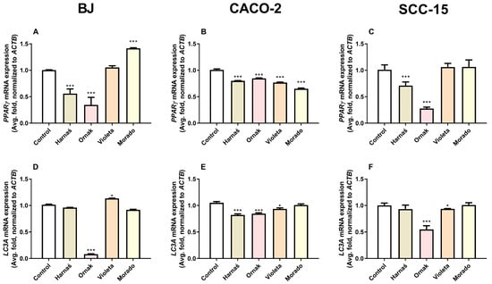 Effect of 0.250 mg/mL of extracts from garlic cultivars Harnaś, Ornak, Violeta, and Morado on mRNA expression of (A–C) PPARγ and (D–F) LC3A in (A,D) BJ, (B,E) CACO-2, and (C,F) SCC-15 cells after 6 h of exposure. ACTB was used as the reference gene. Results are presented as mean ± SD. Statistically significant differences from the control are marked as * p < 0.05 and *** p < 0.001.