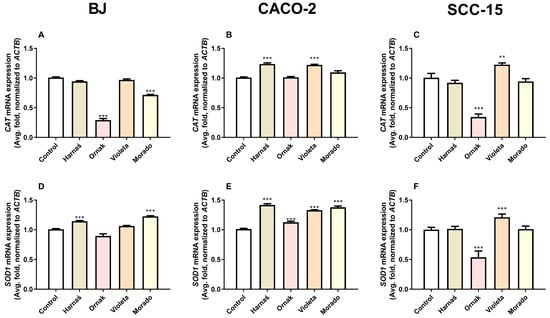 Effect of 0.250 mg/mL of extracts from garlic cultivars Harnaś, Ornak, Violeta, and Morado on mRNA expression of (A–C) CAT and (D–F) SOD1 in (A,D) BJ, (B,E) CACO-2, and (C,F) SCC-15 cells after 6 h of exposure. ACTB was used as the reference gene. Results are presented as mean ± SD. Statistically significant differences from the control are marked as ** p < 0.01 and *** p < 0.001.