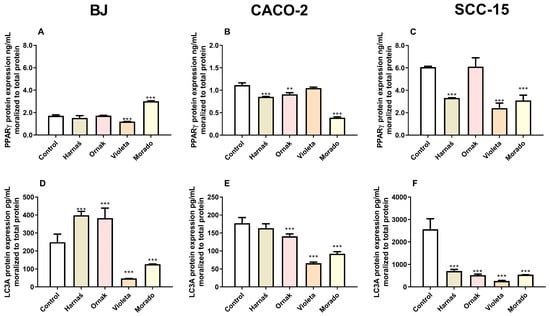 Effect of 0.250 mg/mL of extracts from garlic cultivars Harnaś, Ornak, Violeta, and Morado on protein expression of (A–C) PPARγ and (D–F) LC3A in (A,D) BJ, (B,E) CACO-2, and (C,F) SCC-15 cells after 6 h of exposure. Protein levels were normalised to total protein. Results are presented as mean ± SD. Statistically significant differences from the control are marked as ** p < 0.01 and *** p < 0.001.